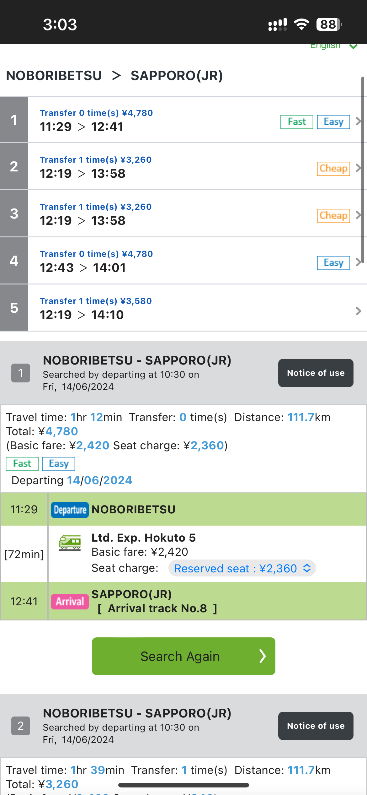 노보리베츠에 도착한 시점에서 젤 빠른 열차로 발권했는데