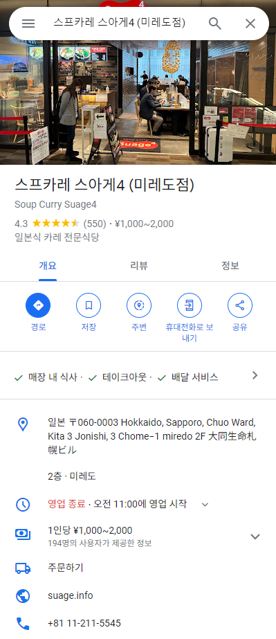 지난 여행때 못먹은 스프카레 이번에는 꼭 먹겠다고 다짐을 했기에 호텔에서 가까운 스프카레집을 찾았다.