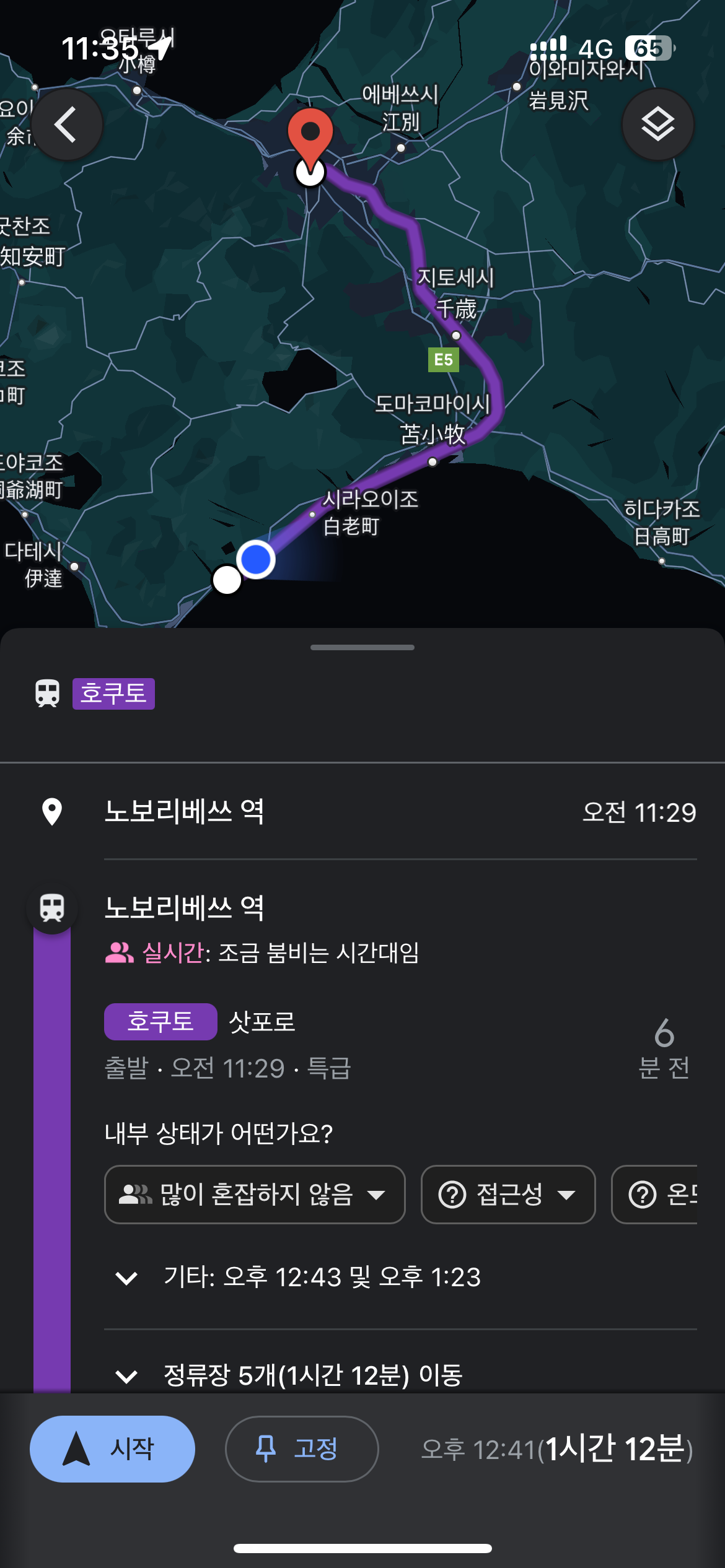 노보리베츠역 11:29분 출발 -> 삿포로역 12:41분 도착이 제일 빠른 편이였다.